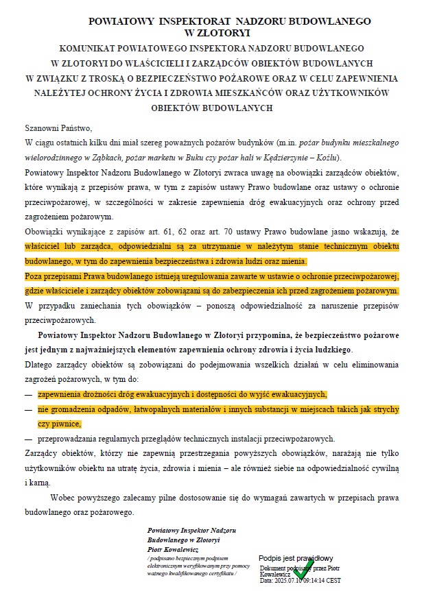 - Zgodnie z ustawą z 24 sierpnia 1991 r. o ochronie przeciwpożarowej, odpowiedzialność za bezpieczeństwo spoczywa na właścicielach obiektu, czyli na zarządzie wspólnoty lub spółdzielni. Jednocześnie należy zastrzec, że realizację obowiązków z tego zakresu mogą oni w całości lub w części przekazać zarządcy lub użytkownikowi. W takiej sytuacji zostaje zawarta odpowiednia umowa cywilnoprawna. Gdyby nie została ona podpisana, odpowiedzialność spoczywa na faktycznie władającym budynkiem, obiektem budowlanym lub danym terenem - podsumowuje st. bryg. Paweł Frątczak.